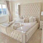A tall winged headboard with deep buttoning and piping detail, bringing classic elegance and bold presence to any bedroom.