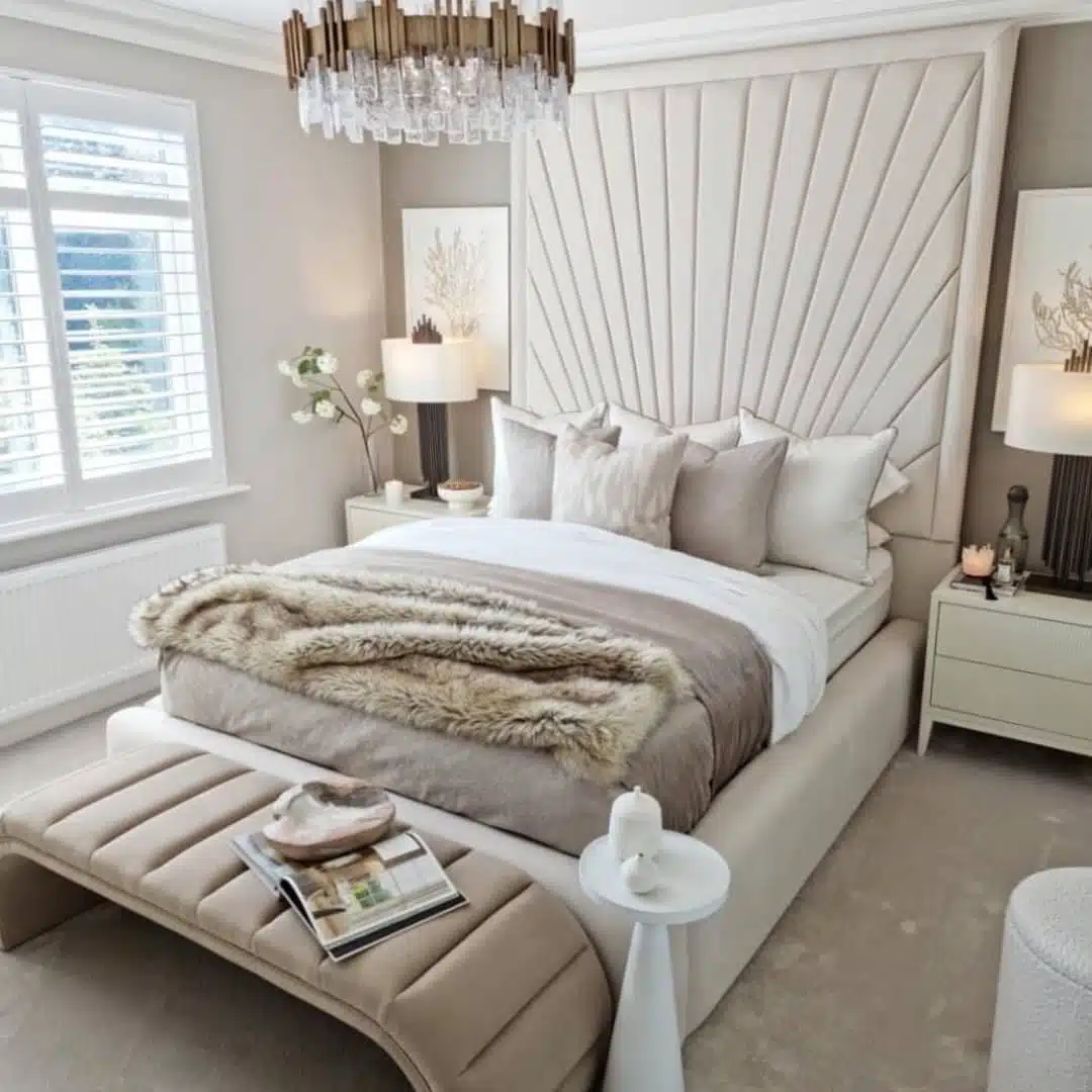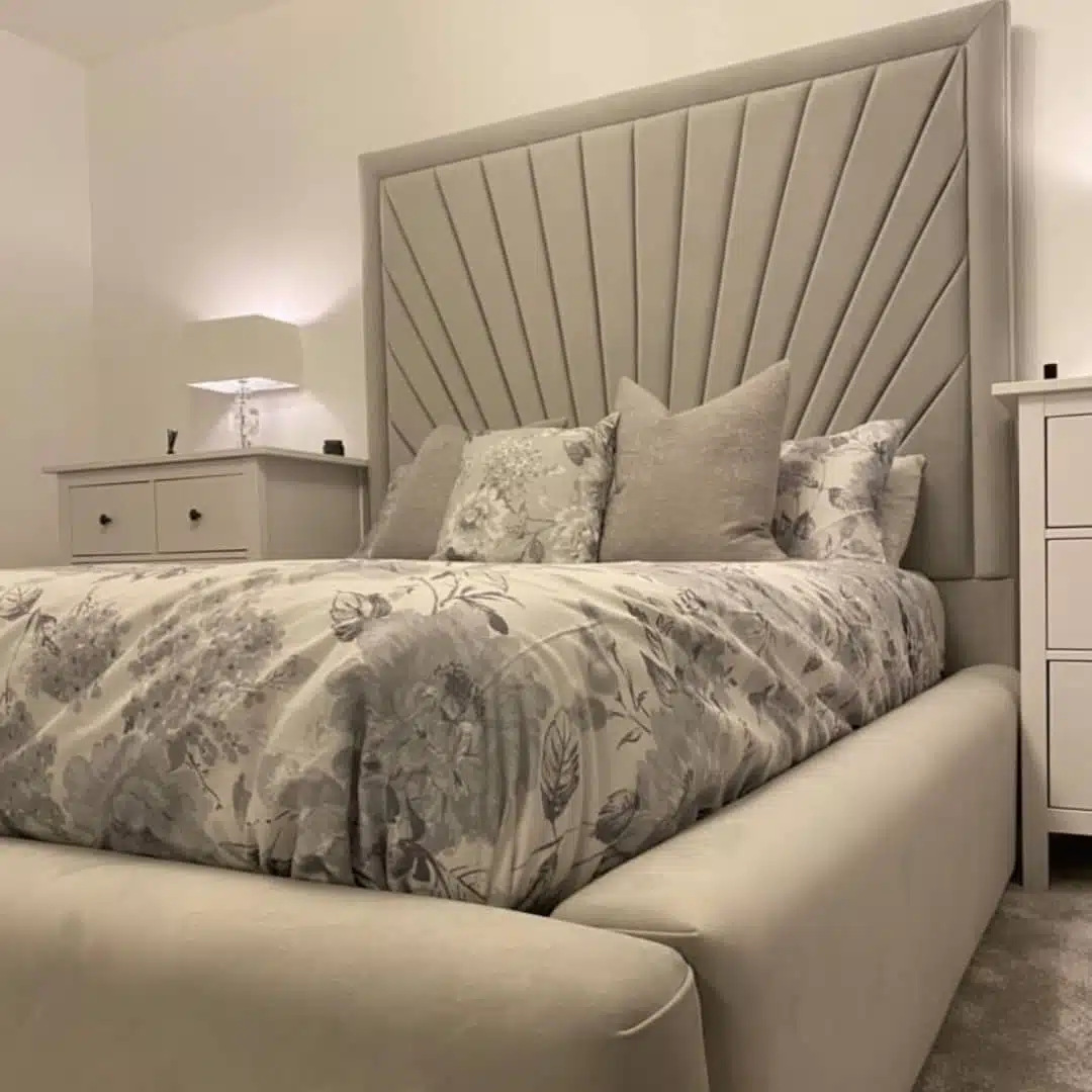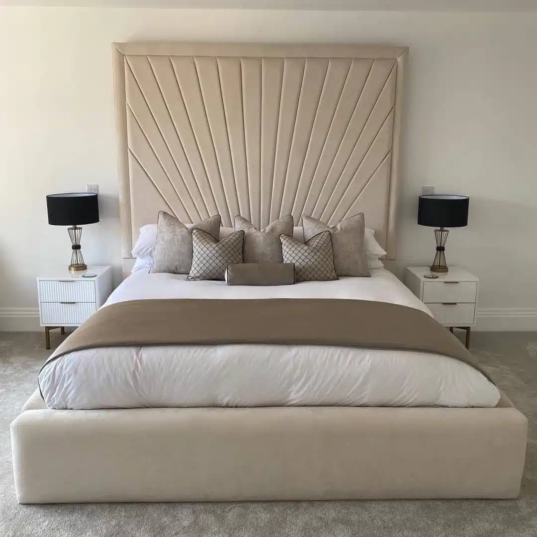 The Ava Grace Bed features a tall sun-ray headboard with a plain border and low, rounded padded sides and footend for a soft yet striking bedroom centrepiece.