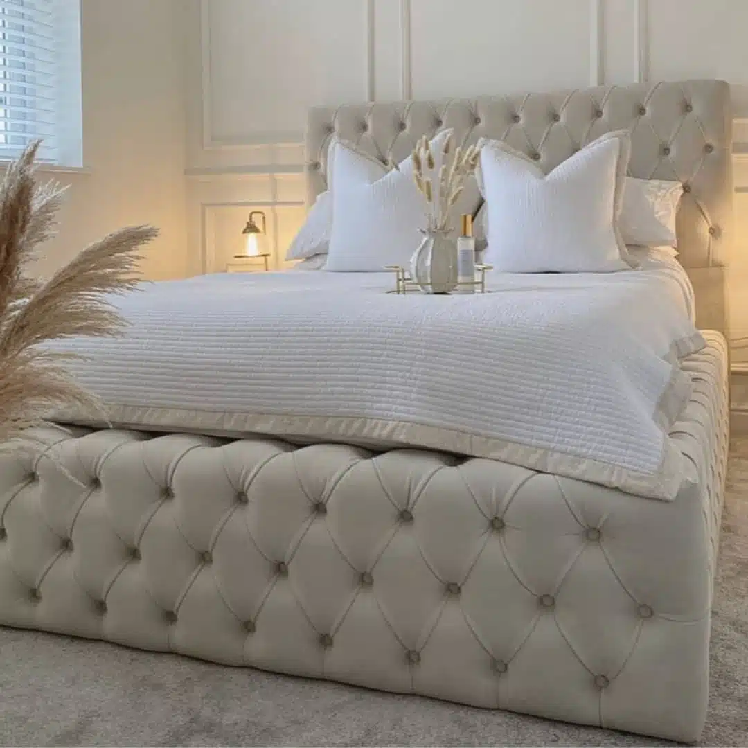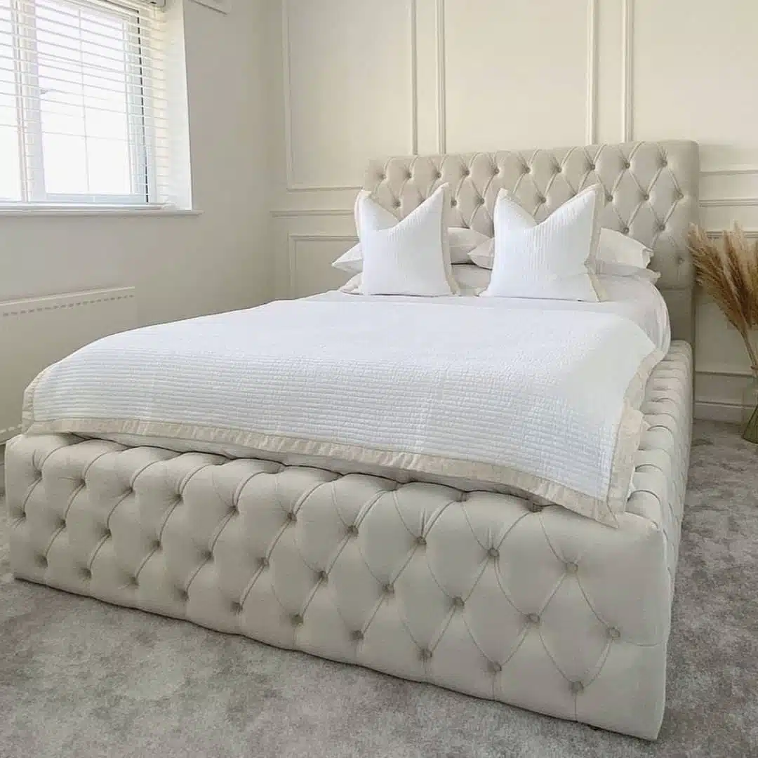 The Celine Bed features a mid-height buttoned headboard with matching buttoned sides and footend, offering a clean, minimalist look with optional lift-up storage.