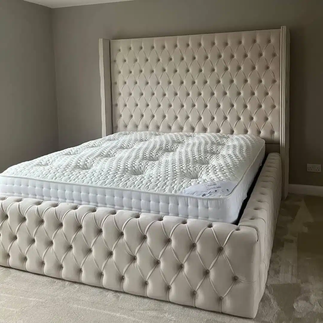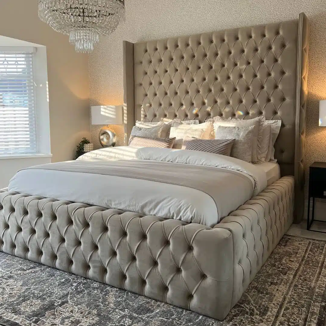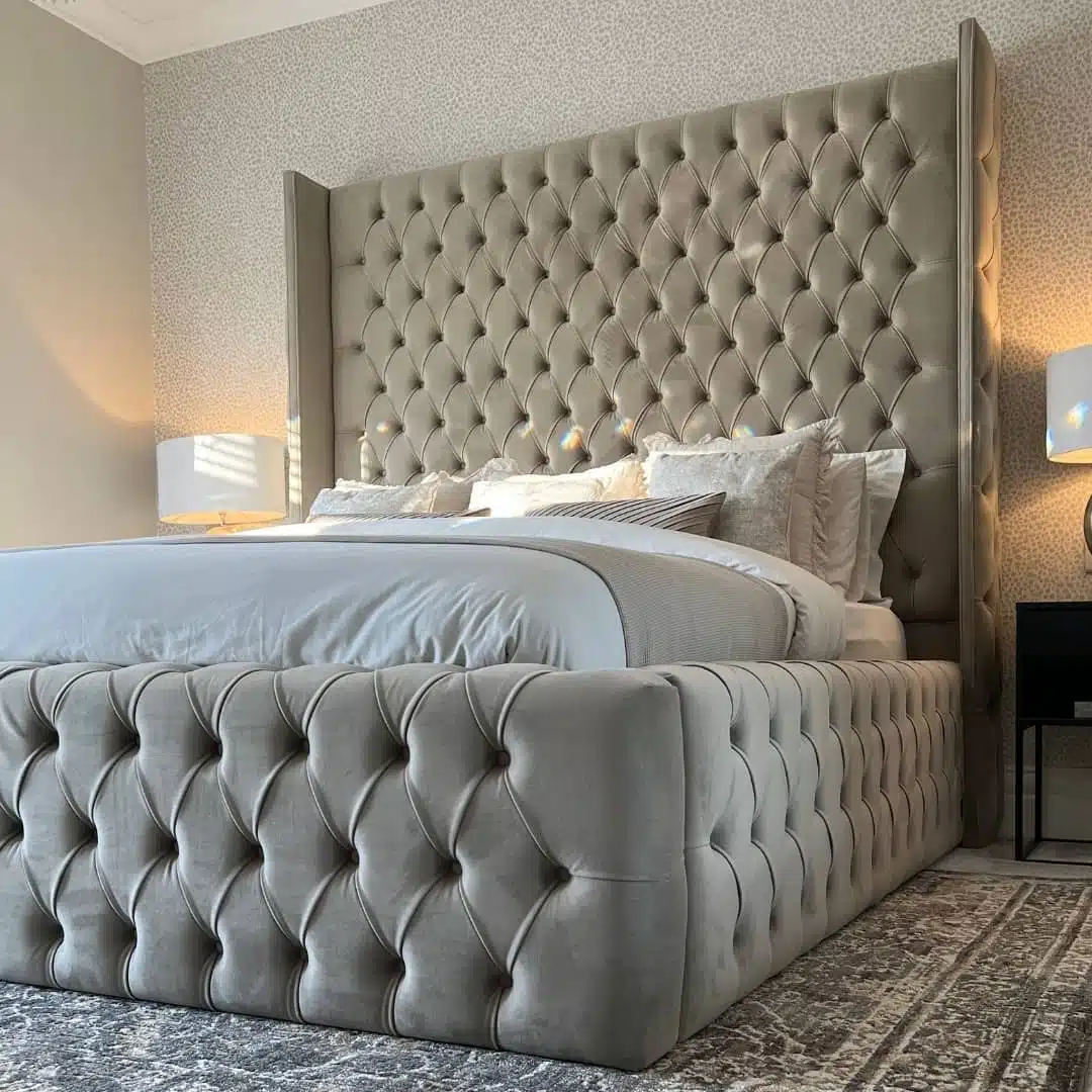 The Charlie bed delivers bold, full-height luxury with deep buttoning, strong lines, and standout structure. Its tall, buttoned headboard is framed by wide wings with piped edging – available in any fabric or colour to either match or contrast the main frame for a fully customised finish.