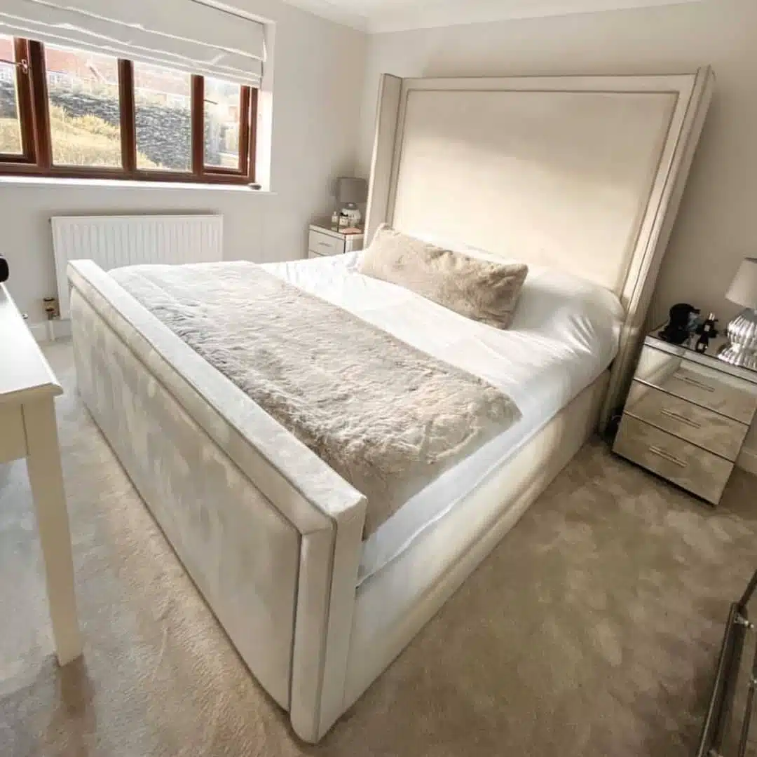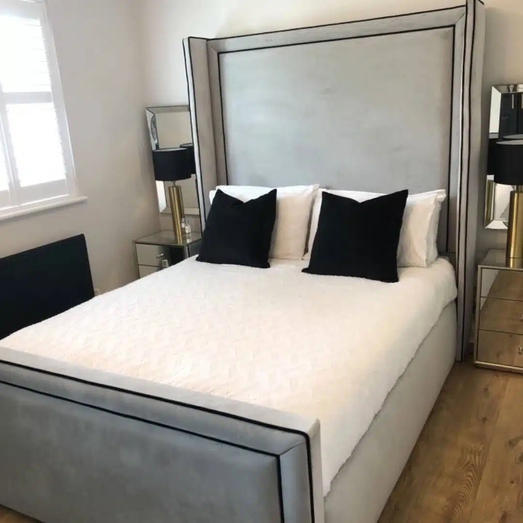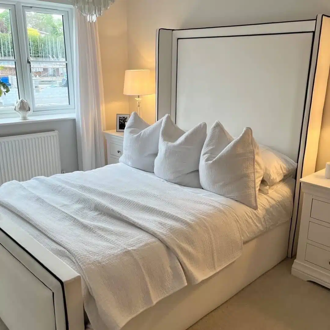 The Ellie Bed features a tall plain headboard with a piped border and matching wings and footend, offering timeless elegance with optional lift-up storage.