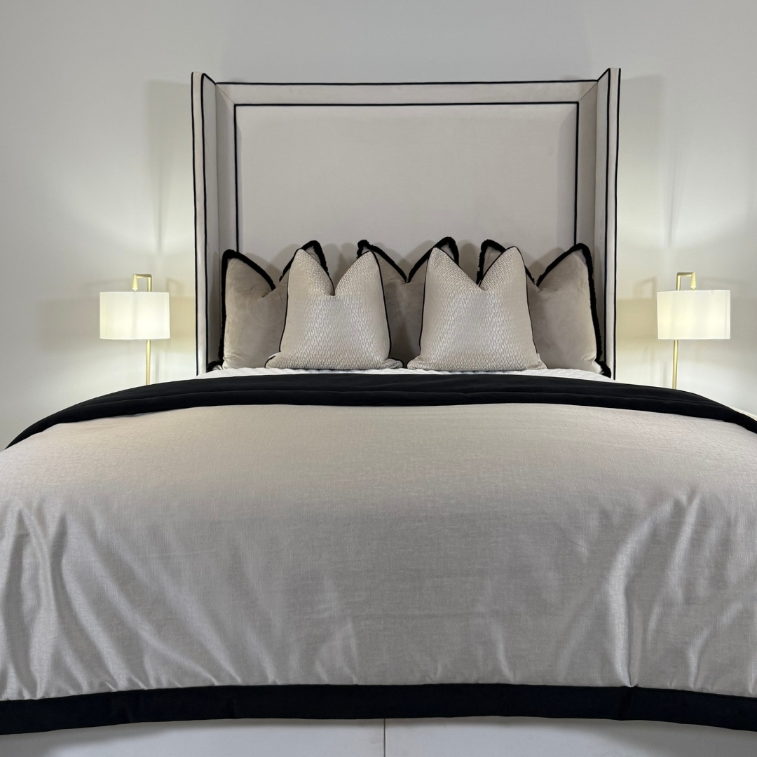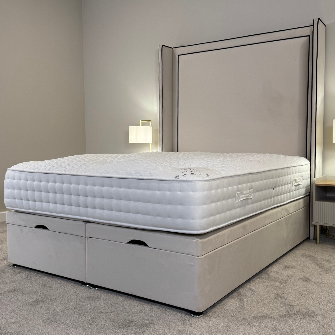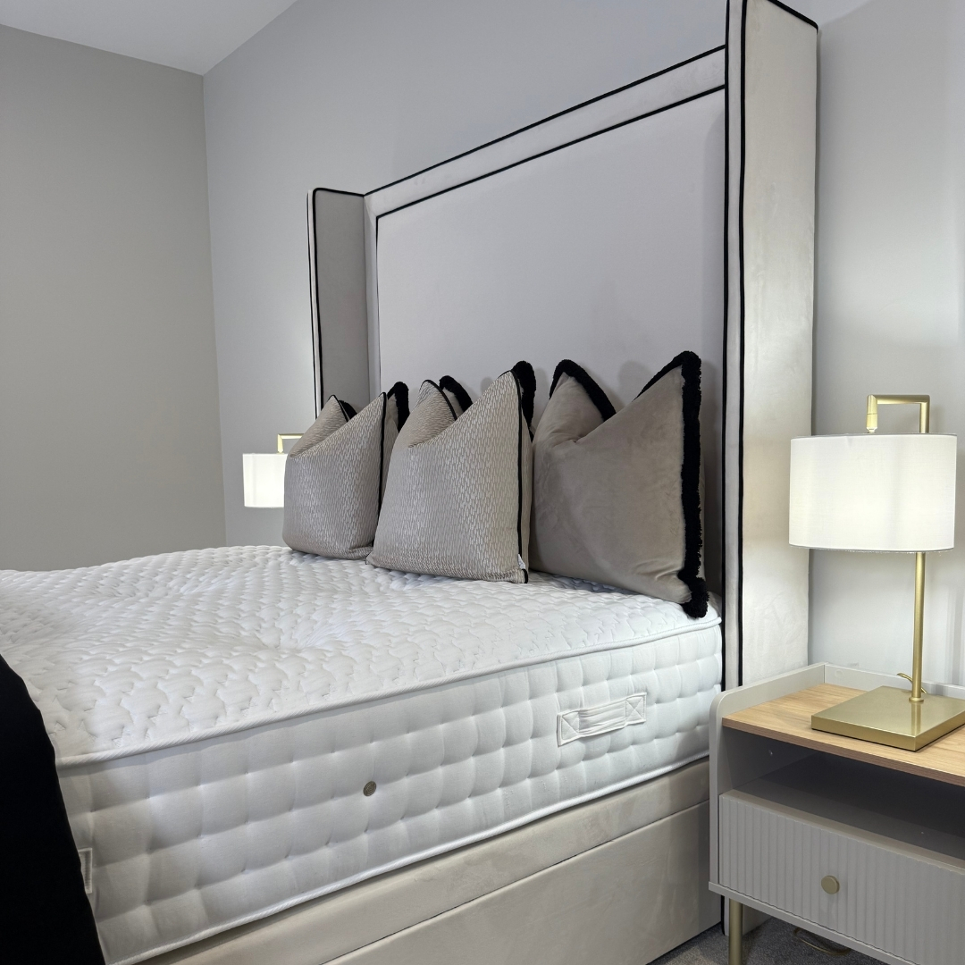 The Ellie Ottoman Bed brings the timeless elegance of the Ellie design together with smart, hidden storage. The tall headboard remains the focal point, featuring a smooth, plain centre framed by a clean upholstered border and finished with precision piping. Square wings on either side add structure and balance, giving the bed a refined, tailored presence.