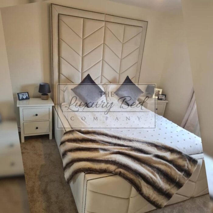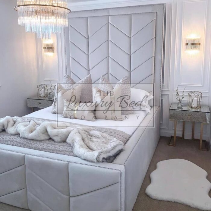 The Grandeur Bed features a tall chevron-detailed headboard with a bordered frame and a matching high chevron footboard, creating a bold, elegant centrepiece.