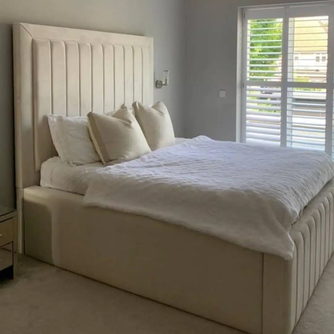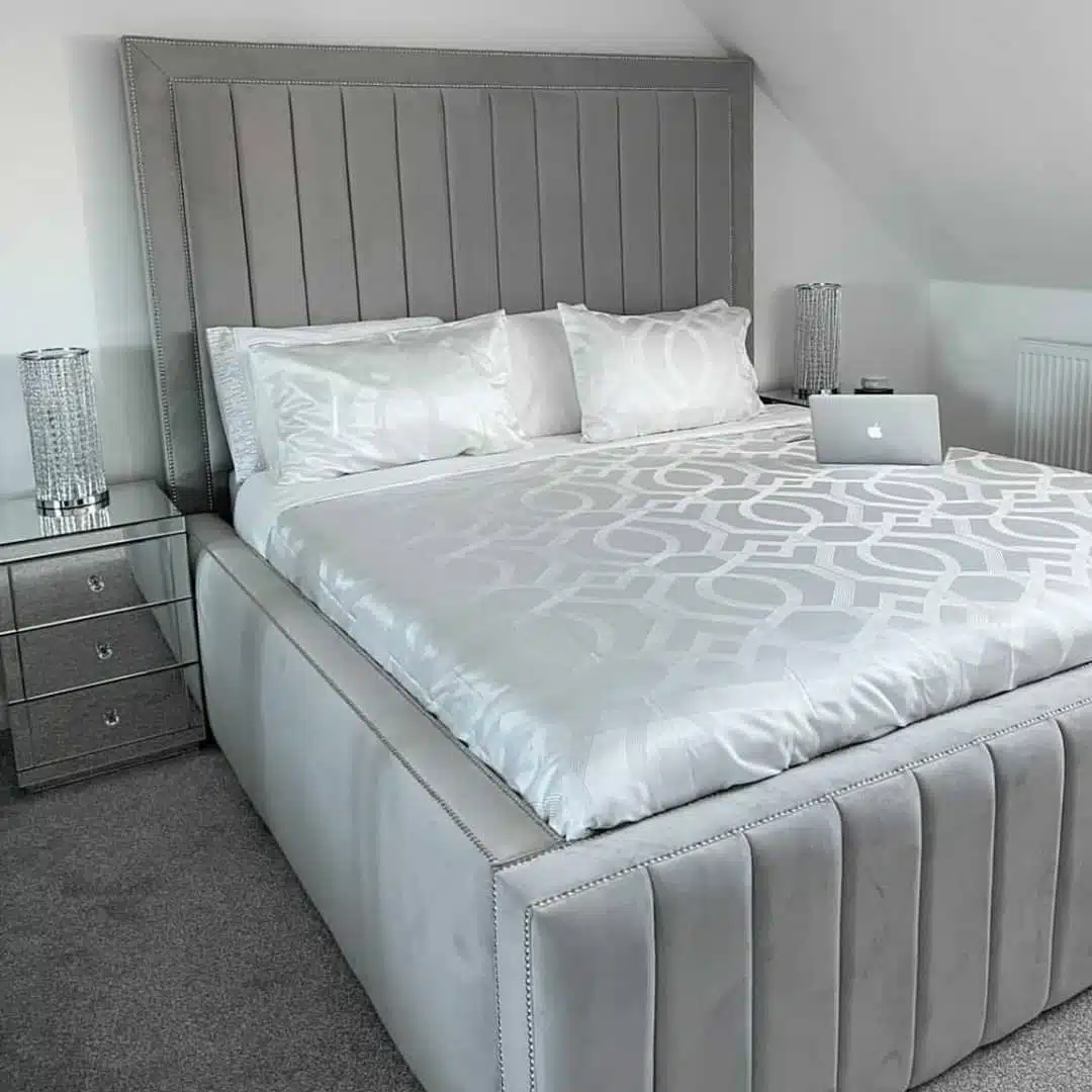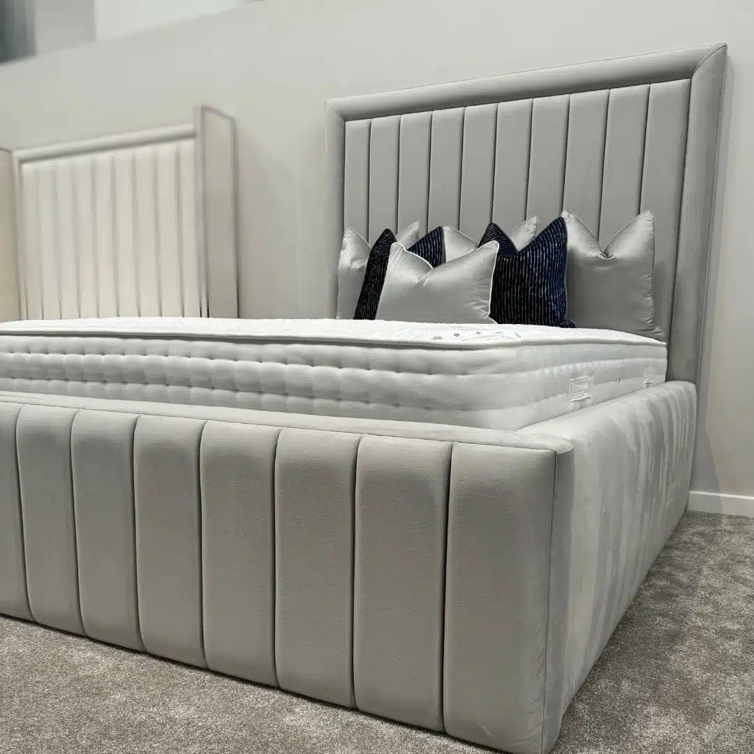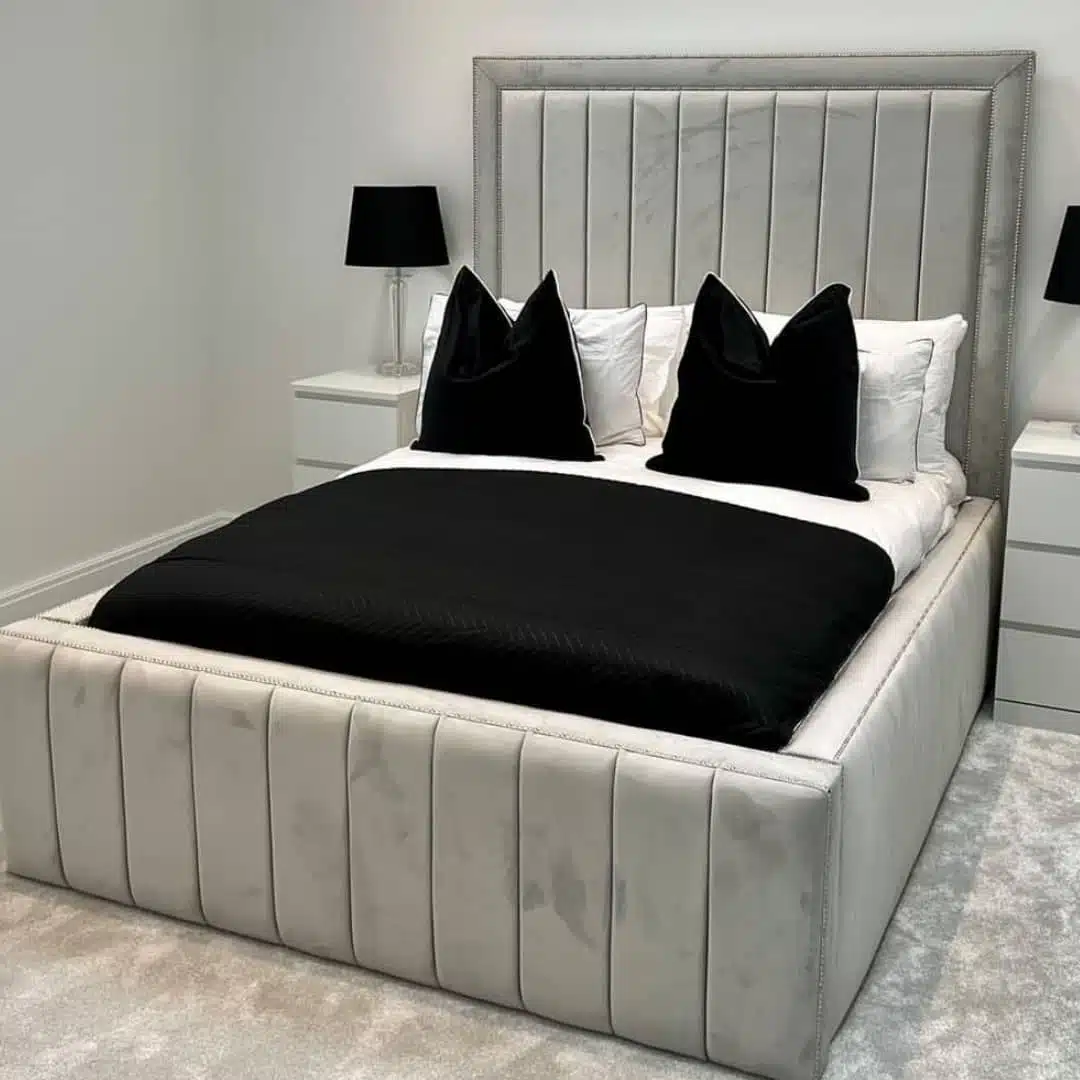 The Richardson Royale Bed is designed for those who want strong lines and a truly grand presence. Its tall headboard is framed by a smooth plain border, while the main section is upholstered with refined vertical lines that add structure and depth.