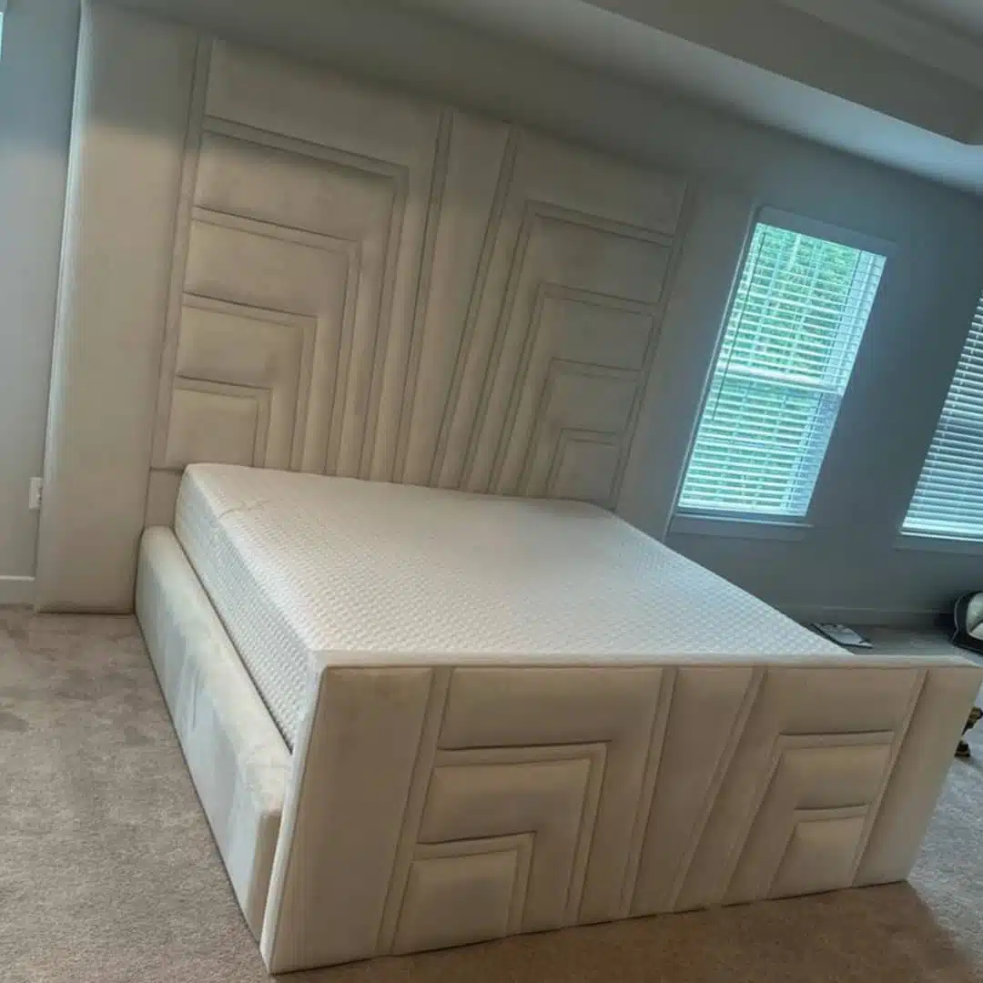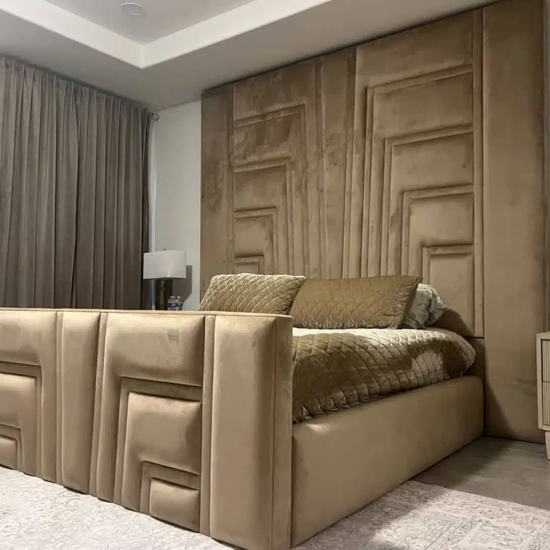 - Art Deco–inspired headboard with geometric panel design