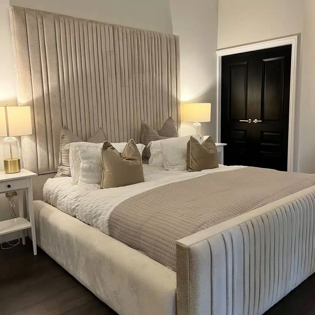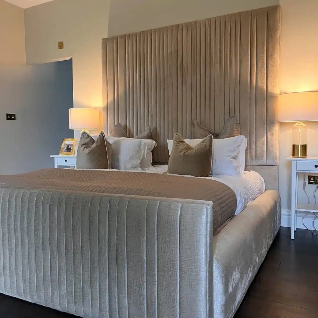 A high footend mirrors the headboard’s vertical pattern for a unified look. Because every bed is handmade to order, the exact layout and spacing of the lines will adjust to suit your chosen size, so the final piece may differ slightly from the example image. Low, luxuriously padded side rails complete the design, keeping the overall profile elegant and inviting. Optional lift-up storage can be added for discreet practicality.